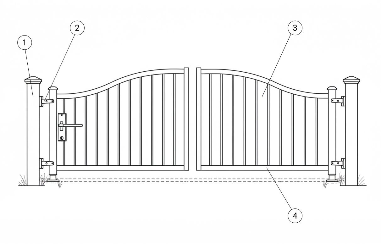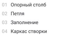 Изделия создают из каркаса, столбов, и наполняют створки выбранным заказчиком материалом. Каркас изготовлен из трубы прямоугольной или квадратной. Для столбов подходит профиль 100х100 мм или 80х80 мм.